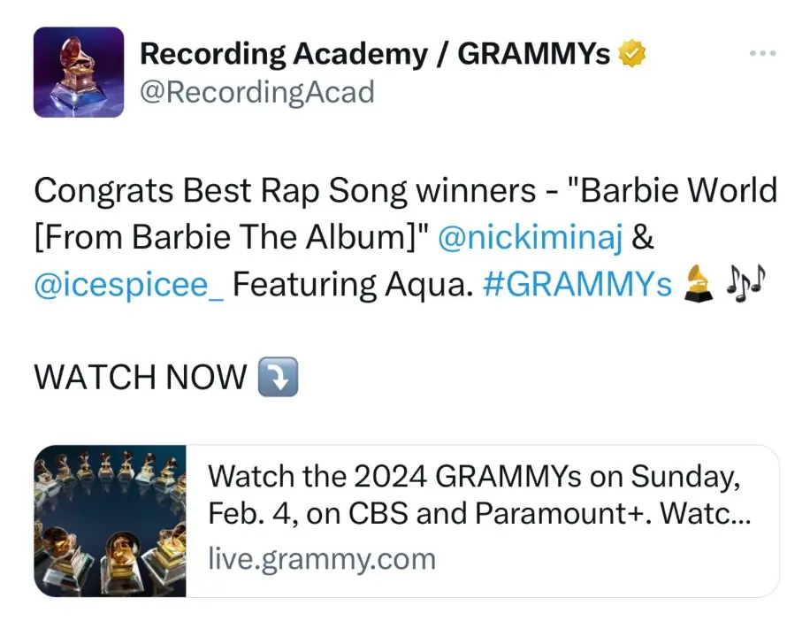 The original tweet announcing the incorrect winners was quickly replaced, but fans were quick to catch the mistake and criticized the Academy for the blunder. Despite the mix-up, Nicki Minaj, who had two nominations for "Barbie World," did not secure her first Grammy win.